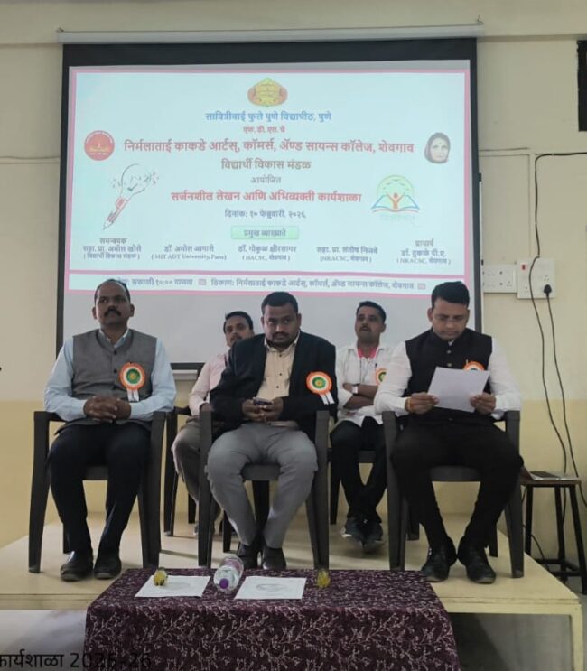 भातकुडगाव फाटा : सावित्रीबाई फुले पुणे विद्यापीठ, पुणे व कर्मयोगी आबासाहेब काकडे शैक्षणिक समूहाचे निर्मलाताई काकडे आर्टस्, कॉमर्स अँड सायन्स कॉलेज शेवगाव येथे विद्यार्थी विकास मंडळांतर्गत १० जानेवारी रोजी एकदिवसीय ‘सर्जनशील लेखन आणि अभिव्यक्ती’ कार्यशाळेचे आयोजन करण्यात आले होते. याप्रसंगी डॉ. अमोल आगासे(एम.आय.टी. युनिव्हर्सिटी,पुणे) यांनी ‘भावनेतून अभिव्यक्तीकडे: प्रभावी काव्यलेखन कला’ या विषयावर मार्गदर्शन केले.