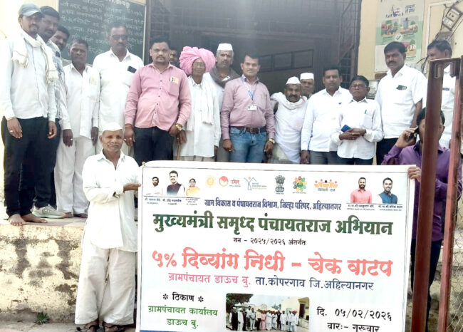 कोपरगाव शहर : कोपरगाव तालुक्यातील स्मार्ट ग्राम म्हणून ओळख निर्माण करणाऱ्या डाउच बुद्रुक ग्रामपंचायतच्या वतीने मुख्यमंत्री समृद्ध पंचायत राज अभियान अंतर्गत कोपरगाव पंचायत समितीचे गटविकास अधिकारी संदीप दळवी यांच्या मार्गदर्शनाखाली सन २०२५-२६ अंतर्गत ५ टक्के निधीतून गावातील १७ दिव्यांग बांधवांना प्रत्येकी ७०० रुपये प्रमाणे ११ हजार ९०० रुपयांचा दिव्यांग निधी वाटप करण्यात आला.