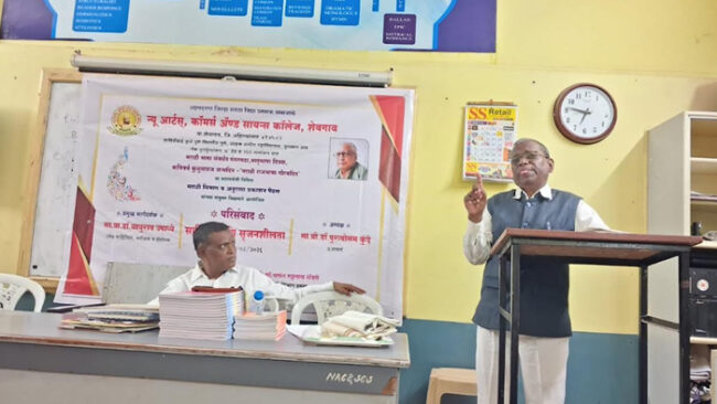 शेवगाव येथील न्यू आर्टस, कॉमर्स ण्ड सायन्स कॉलेजमध्ये अभिजात मराठी भाषादिन विविध उपक्रमांनी साजरा करण्यात आला. याप्रसंगी प्रमुख वक्ते म्हणून डॉ. बाबुराव उपाध्ये बोलत होते.अध्यक्ष स्थानी प्राचार्य डॉ. पुरुषोत्तम कुंदे होते. मान्यवरांनी प्रारंभी ज्ञानपीठ विजेते वि.वा.शिरवाडकर तथा कविवर्य कुसुमाग्रज यांच्या प्रतिमेचे पूजन करून दीपप्रज्वलन करण्यात केले. स्वागत, प्रास्ताविक करून मराठी विभाग प्रमुख प्रो. डॉ. वसंत शेंडगे यांनी पाहुण्यांचा परिचय करून दिला. मराठी भाषा पंधरवाडा आणि मातृभाषा कविवर्य कुसुमाग्रज जन्मदिन, मराठी राजभाषा गौरवदिन या महापर्वणीनिमित्त मराठी विभाग आणि अनुराधा प्रकाशन पैठण यांच्या संयुक्त विद्यमाने आयोजित परिसंवाद, साहित्य आणि सृजनशीलता या विषयावर बोलताना डॉ. बाबुराव उपाध्ये यांनी मराठी भाषेचा अडीच हजार वर्षातील गौरवशाली ऐतिहासिक संदर्भ सांगून आजच्या काळातील. मराठी भाषेची स्थितीगती विशद करून मान्यवर व विद्यार्थ्यांना अनेक पुस्तके भेट दिली. प्राचार्य डॉ. पुरुषोत्तम कुंदे यांनी अध्यक्षीय भाषणात सांगितले की, मातृभाषेतूनच आपली भावनिक व बौद्धिक क्षमता वाढते. मातृभाषे पेक्षा परकीय भाषा पचविणे आणि वापरात आणणे कष्टप्रद ठरते. ज्या देशांनी मातृभाषेतून शिक्षण आणि व्यावहारिक कलाकौशल्ये प्राप्त केले, त्या देशांनी जगात गतीने प्रगती केली, नोबेल पुरस्कार प्राप्त केले, असे सांगून मराठी भाषेला प्रतिष्ठा देणार्या कवी,लेखक, समीक्षक,संशोधकांचे अपूर्व योगदान लक्षात घ्यावे. कविवर्य कुसुमाग्रजांच्या कविता सादरीकरण करून त्यांनी कुसुमाग्रजांचे चरित्रकथन केले. मराठी विभागाच्या उपक्रमांचे कौतुक केले. कार्यक्रमात अध्यक्षीय सूचना कु.गीता रोडगे यांनी केली.अनुमोदन कु. अश्विनी कापसे हिने दिले. सार्थक कापसे, सोमनाथ रोडगे, अभिमन्यू आहेर, साक्षी साळवे, भारती सर्जे, रूपाली जगधने, वर्षा घोडेचोर, बेबी जाधव, सानिया बेग या विद्यार्थ्यांनी मनोगते व्यक्त केली. यानिमित्ताने घेतलेल्या निबंध व कवितालेखन स्पर्धेचे प्रमाणपत्रे,पुस्तके रोख रकमा मान्यवरांच्या हस्ते प्रदान करण्यात आले. सूत्रसंचालन प्रा. बाळासाहेब गबाजी कसबे यांनी केले तर कु. अनुराधा शेटे यांनी आभार मानले. सामुहिक पसायदानाने कार्यक्रमाची सांगता झाली.