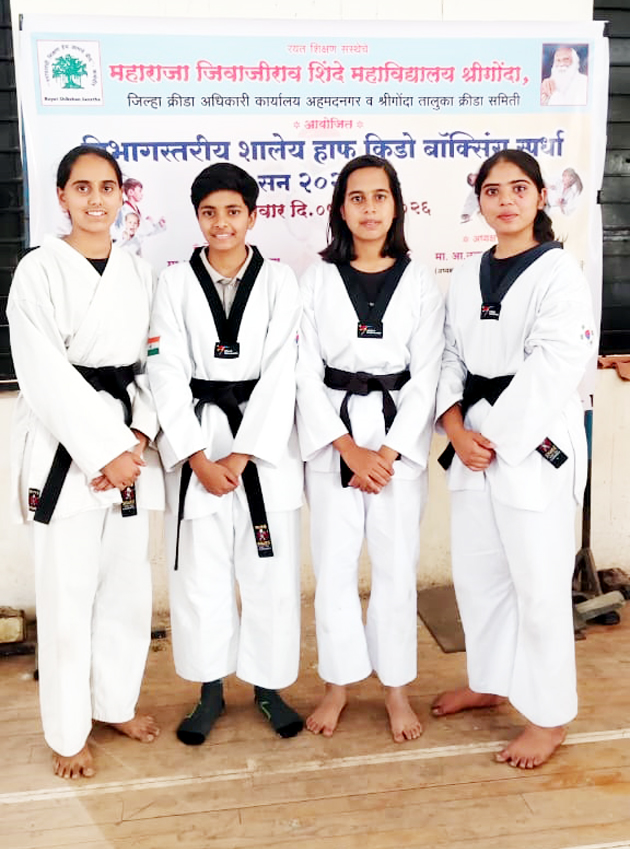 श्रीगोंदा :   महाराजा जिवाजीराव शिंदे महाविद्यालय येथे पार पडलेल्या पुणे विभागीय शालेय हाफ किडो बॉक्सिंग स्पर्धेमध्ये श्रीमंत राजमाता विजयाराजे शिंदे कन्या विद्यालयातील विद्यार्थिनींनी उल्लेखनीय कामगिरी केली. या स्पर्धेत शर्वरी योगेश टकले, वैष्णवी ज्ञानदेव भागवत, श्रावणी भारत भगाडे, वृषाली प्रकाश मोटे या सर्व विद्यार्थिनींनी उत्कृष्ट खेळाचे प्रदर्शन करत सुवर्णपदक पटकावले. त्यांची राज्यस्तरीय शालेय हाफ किडो बॉक्सिंग स्पर्धेसाठी निवड झाली.