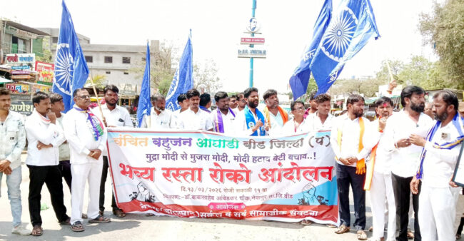 बीड : वंचित बहुजन आघाडीच्या वतीने नेकनूर येथे मोदी हटाव, देश बचाव या घोषवाक्याखाली भव्य रस्ता रोको आंदोलन करण्यात आले. केंद्र सरकारच्या धोरणांव