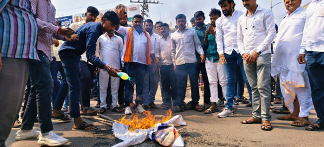 पाथर्डी : काँग्रेसचे महाराष्ट्र प्रदेशाध्यक्ष हर्षवर्धन सपकाळ यांनी छत्रपती शिवाजी महाराज आणि टिपू सुलतान यांची तुलना करणाऱ्या वक्तव्याचा निषेध म्हणून शहरातील नाईक चौकात भाजप व विविध हिंदुत्ववादी संघटनांनी सपकाळ यांचा प्रतिकात्मक पुतळा दहन करून निषेध व्यक्त केला.