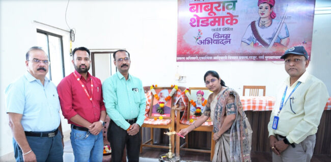 अकोले : राजूर येथे आदिवासी विकास प्रकल्प यांच्या वतीने आदिवासी क्रांतिवीर बाबुराव शेडमाके व महाराष्ट्राचे पहिले मुख्यमंत्री यशवंतराव चव्हाण यांची जयंती राजूर प्रकल्प कार्यालयात येथे उत्सवात साजरी करण्यात आली. यावेळी कार्यक्रमाचे अध्यक्ष प्रकल्प अधिकारी देवकन्या बोकडे होत्या. प्रथम क्रांतिवीर बाबुराव शेडमाके यांच्या प्रतिमेस पुष्पहार वाहून कार्यक्रम सुरुवात केली. राज्य सरकारच्या वतीने प्रथमच आदिवासी विभागाच्या वतीने साजरी करण्यात आली. यावेळी सहाय्यक प्रकल्प अधिकारी अंबादास बागुल,प्रमोद राऊत, मनोज सोनवणे, प्रमोद शिंदे आदींनी मनोगत व्यक्त केले. तर सहाय्यक प्रकल्प अधिकारी तुषार पवार, श्याम कांबळे, सुनील मोरे, अमोल जाधव संजय सुसलादे , शिंदे तसेच वस्तीगृहातील मुले मुली व कार्यालयीन सर्व कर्मचारी उपस्थित होते.सूत्रसंचालन व प्रास्ताविक चौधरी आर आर यांनी केले तर आभार देवेंद्र शेंडे यांनी मानले. चंद्रपूरचे जिल्ह्याचे सुपुत्र वीर बाबुराव शेडमाके यांचा जन्म १२ मार्च १८३३ रोजी मोल्लंपल्ली (अहेरी) येथील श्रीमंत शेडमाके जमीनदारी येथे झाला. तर २१ ऑक्टोबर १८५८ रोजी शहीद झाले होते.