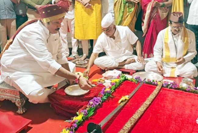 सातारा : जल मंदिर येथे श्री भवानी तलवारीचे पूजन करताना खा. श्री. छ. उदयनराजे भोसले. पोवई नाक्यावरील शिवतीर्थावर भवानी तलवारीचे पूजन करताना खा. श